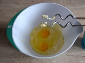 Добавьте в масляную смесь 2 яйца, взбивайте еще 3-5 минут.