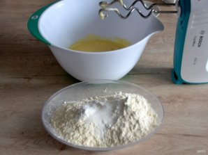 Смешайте сухие ингредиенты: муку, соль, разрыхлитель, ванильный сахар. Всыпьте во взбитую масляную смесь, замесите тесто.