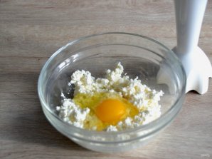 Пока тесто в холодильнике, займитесь приготовлением творожной начинки. Пробейте творог блендером вместе с яйцом до гладкости.