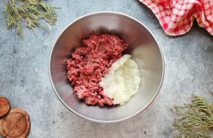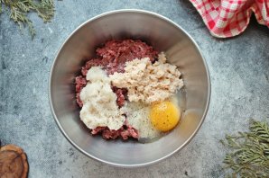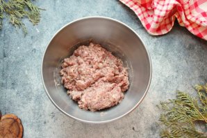Тщательно перемешайте фарш и отбейте его до вязкого состояния. Для этого соберите фарш в руку, поднимите над чашкой и бросьте обратно. Проделайте эту процедуру 10-15 раз.