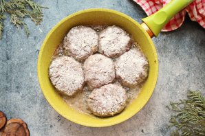 Влажными руками сформируйте круглые котлетки и запанируйте в муке. В сковороду налейте растительное масло и разогрейте на среднем огне. Положите котлеты в один ряд на небольшом расстоянии.