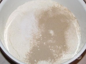2. Воду подогрейте немного и вылейте в глубокую мисочку. Добавьте стакан просеянной муки, дрожжи и сахар.