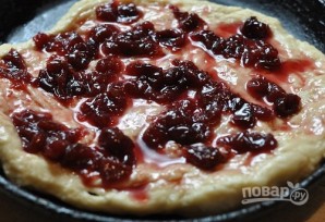 6. Когда тесто подошло, разделите его пополам. Чашу мультиварки смажьте растительным маслом. Выложите один пласт теста, распределив его ровным слоем. Сверху распределите варенье.