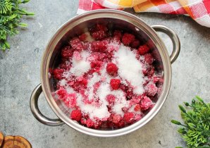 Малину и смородину выложите в кастрюлю с толстым дном, пересыпая сахаром.