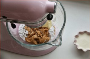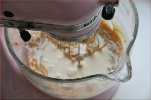 Хорошенько взбиваем. Масса должна стать однородной и воздушной. Затем добавляем сливки.