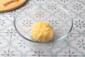 Если оно получается слишком сухим и рассыпчатым, допустимо добавить еще немного воды. Накройте тесто пленкой и дайте постоять 10 минут при комнатной температуре.