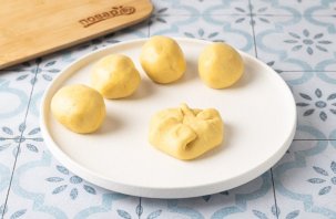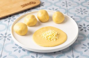Разделите тесто на шарики. Руки можно слегка смазать растительным маслом, чтобы было проще работать с тестом. Каждый шарик раскатайте и выложите в центр тертый сыр.