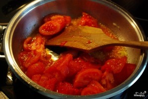 Помидоры очищаем от шкуры (опускаем в кипяток на пол минутки), нарезаем кусочками, удаляем семена и отправляем в сковородку с маслом.