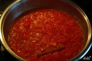 В томатную массу добавляем палочку корицы, гарам масала и соль. Варим на среднем огне, чтобы соус немного уварился (около 15 минут).