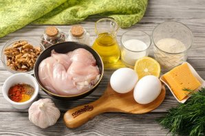 Подготовьте все ингредиенты. Можете использовать не только филе, но и любые другие части курицы. Помимо указанных специй можете взять свои по вкусу. Сыр подойдёт любой, который хорошо плавится.