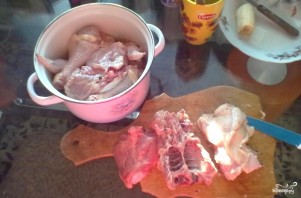 Курицу разделываем на порционные кусочки и тщательно промываем под холодной водой.