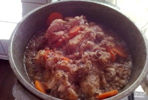 Перекладываем лук к курице, морковь нарезаем кольцами ( можно ее перед этим отварить до полуготовности) и так же переложить в казан. Заливаем пиво, солим и посыпаем специями по вкусу. Готовим около получаса, а за 10 минут до готовности всыпаем немного муки, чтобы соус загустел.
