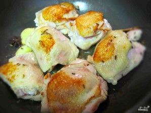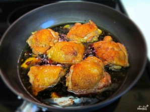 Влейте смесь соевого соуса. Тушите на медленном огне в среднем около в течение 10 минут. Переверните куриные бедра и продолжайте тушить еще 10 минут ..