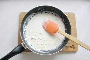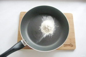 Приготовьте сливочный соус. В сковороду насыпьте муку.