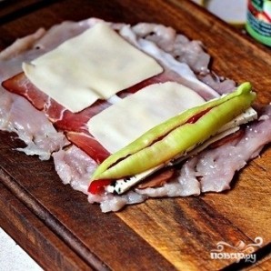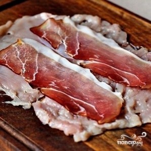 На отбитые грудки выкладываем по ломтику ветчины или бекона.
