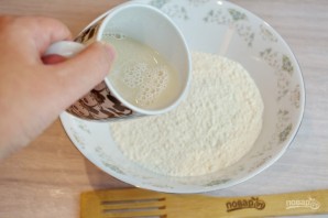В чашку поместите сухие быстродействующие дрожжи. Добавьте 1 яйцо (оно должно быть комнатной температуры). Добавьте 1 ч. ложку соли и 1 ч. ложку сахара. Влейте теплой воды столько, чтобы общее количество жидкости в чашке получилось размером по объему чашки (250 мл). Взболтайте. Оставьте жидкость на 20 минут в покое. Дрожжи проснутся. Влейте дрожжевую жидкость в муку. Замесите тесто.