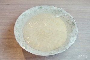 Затяните миску пленкой и оставьте тесто в теплом месте подходить. Я расположила миску с тестом на столе возле батареи. У меня тесто взошло за 1,5 часа.