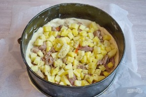 Разделите тесто на два куска. Из этого теста у меня вышло 2 курника. Одну часть теста раскатайте в пласт толщиной 1,5 см. Уложите тесто в форму. Обрежьте лишнее. На тесто выложите нарезанную отварную курицу и картофель. Посолите, поперчите по вкусу.