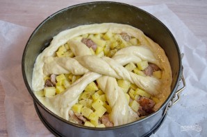 Аккуратно влейте в промежутки между тестом 3-4 ст. ложки молока в начинку. Если это сделать до того, как пирог сформован, есть риск, что пирог поплывет. Вы не сможете его оформить аккуратно, так как тесто намокнет. Разогрейте духовку до 200 градусов. Выпекайте пирог в духовке 40 минут до румяности.