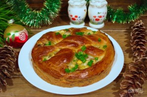 Из обрезков теста сформируйте жгутики, с помощью которых оформите курник. Тут ваша фантазия может быть вольна, украсьте пирог, как вам нравится. Смажьте пирог взбитым желтком.