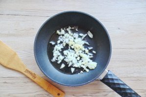 Очистите лук и чеснок, помойте, нарежьте мелко и выложите в сковороду с подсолнечным маслом. На среднем огне обжарьте до прозрачности лука.