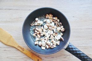 Шампиньоны вымойте, очистите и нарежьте мелко. Добавьте в сковороду с луком и чесноком. Обжаривайте ещё 3 -5 минут.