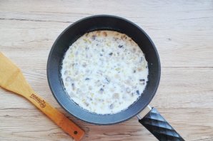 Добавьте в сковороду с грибами, луком и чесноком сливки. Посолите, поперчите и насыпьте сушеный базилик. Перемешайте и готовьте помешивая до загустения минут 5-6.