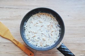 Отваренную заранее курицу нарежьте мелко и выложите в сковороду к остальным ингредиентам. Перемешайте соус с курицей.