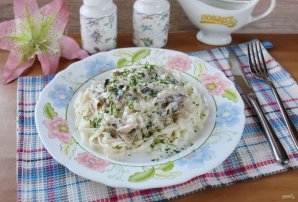 Блюдо готовится без лишних сложностей. Что может быть проще, чем макаронные изделия, приготовленные с мясом. Однако простота не означает, что это из разряда «на скорую руку». Вариантов таких блюд много, но я предлагаю приготовить лапшу, сделав её более нежной, с приятным сливочным вкусом. А дополнит его грибной аромат шампиньонов. Куриное мясо, которое само по себе диетический продукт, впитает в себя всю вкусовую гамму ингредиентов при тушении. Оно станет ароматным, нежным и доставит удовольствие вашим домашним в обед или за ужином. Берите на заметку Готовое блюдо можно подавать к столу.