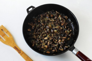 Одну луковицу нарежьте кубиками и обжарьте до мягкости. Добавьте измельченные ножом грибы и готовьте все вместе до испарения жидкости.