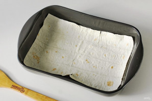 При помощи кухонных ножниц, разрежьте лаваш на листы, размером подходящими к размеру формы для запекания. Всего необходимо 4 листа. Выложите первый лист (я делаю его с небольшими бортиками).