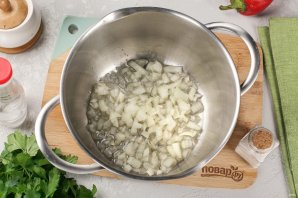 В казанке или любой посуде с толстым дном разогрейте растительное масло. Выложите нарезанный кубиками лук и обжарьте до прозрачности.