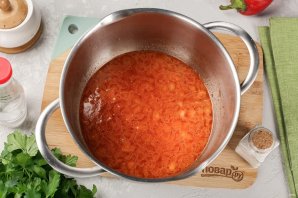 Затем добавьте воду, соль, сахар и томатную пасту. Помешивая доведите до кипения.