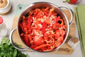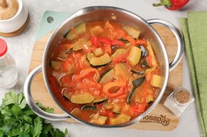 Добавьте нарезанные кубиками или дольками, среднего размера, кабачки. Нарезанные дольками помидоры, небольшой соломкой нарезанный болгарский перец и измельчённый чеснок.