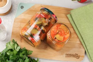 Горячий салат разложите в стерилизованные банки и закрутите крышками. Переверните и укутайте до остывания.