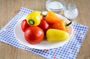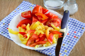 Помидоры промойте и нарежьте дольками, срезав плодоножку. Сладкий перец почистите от семян и хвостиков, нарежьте полосками для лечо.