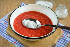 Томатный соус вскипятите и добавьте соль с сахаром, перемешайте, чтобы сыпучие полностью растворились.