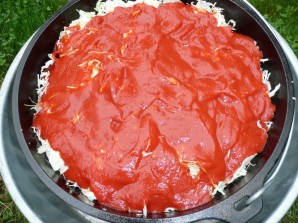 2. Сверху выложите томатное пюре. Не перемешивайте.