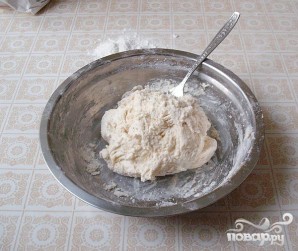 2. Перемешиваем, добавляем муку и ванилин. Замешиваем достаточно липкое, мягкое тесто, накрываем полотенцем или салфеткой. Минут на десять-пятнадцать поставим его в холодильник.