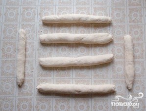 3. На несколько порций его разделим, стол посыпем мукой, порции раскатаем колбаской приблизительной толщины два-три сантиметра. Чтобы к столу не прилипало тесто, должно быть достаточно муки.