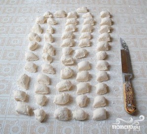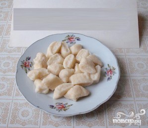 5. Вскипятим в казане или кастрюльке воду, подсолим ее, кусочки теста бросаем туда и варим, помешиваем, чтобы не прилипали. Варим, пока не всплывут вареники. Огонь уменьшаем и варим еще минут пять. Готовые вареники выкладываем на блюдо и поливаем сметаной. Можно класть немного сливочного масла.