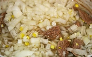 2. Мясо зачищаем и моем, нарезаем небольшими кусками и перекладываем в глубокую сковороду, заливаем водой и тушим 25 минут, после чего нарезаем кубиками лук и отправляем его к мясу, тушим все до полной готовности мяса.