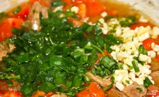 3. Томаты бланшируем, после чего нарезаем кубиками, чеснок чистим и моем, нарезаем небольшими кусочками. Зелень моем и рубим, все добавляем к мясу и тушим еще 10-15 минут.