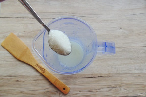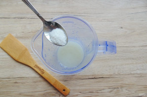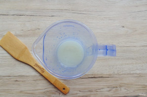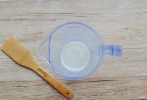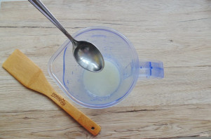 Взбейте рассол с сахаром, солью, горчицей и уксусом погружным блендером слегка, до образования пены.
