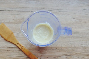 Потом постепенно, тонкой струйкой вливайте подсолнечное масло, не переставая взбивать ингредиенты. Примерно через 3-4 минуты майонез начнёт приобретать нужную консистенцию.