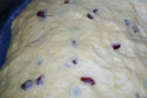 В большой емкости соединяем муку и дрожжевую смесь. Хорошенько месим тесто, добавив в него изюм. Накрываем тесто полотенцем и ставим в теплое место для подъема (обмять пару раз).