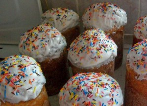 Чтобы приготовить глазурь, взбиваем два белка с сахарной пудрой и ложечкой лимонного сока. Покрываем маленькие пасхи глазурью и присыпаем посыпкой.