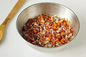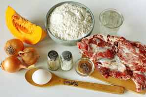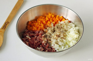 Мясо, лук и тыкву нарежьте мелкими кубиками, чем мельче получится, тем лучше. Все соедините в глубокой миске, добавьте специи и соль по вкусу.