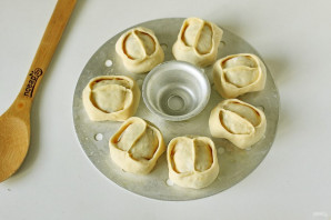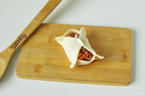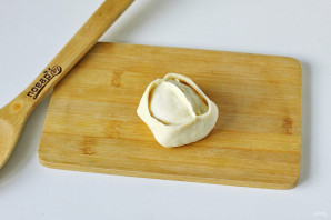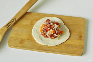 Обваляйте каждый кусочек с двух сторон в муке и раскатайте в форме круга. По центру положите 1-2 ст.л. начинки.