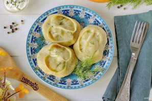 Подаем манты горячими с любимым соусом, сливочным маслом и свежей зеленью.